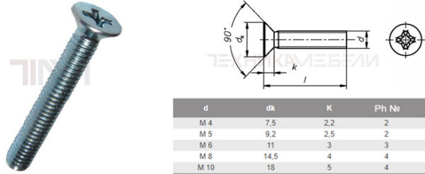Винт DIN 965 (DIN-EN-ISO 7046) потайная головка, крест. шлиц PH