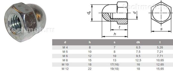 • 107 12 Гайка DIN 1587 ГОСТ 11860-85 шестигранная, колпачковая (высокая) M6
