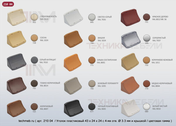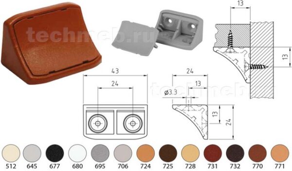 • 210 04 Уголок пластиковый 43 х 24 х 24 с 4-мя отв. диаметр 3.3 мм и крышкой