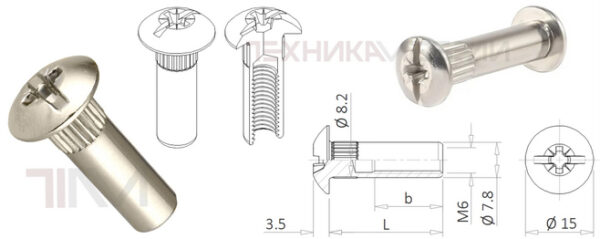 - 555 A6 • Гайка стяжки M6х41,4 (тело диаметр 7.9 мм) с плоской головкой Ø 15 мм, вн-ш №4