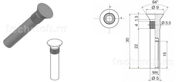 • 567 P0 Гайка с накаткой M4х30, потайная головка диаметр 9 мм, без шлица d M4 l 30