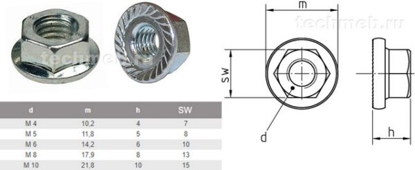 109 34 Гайки DIN 6923, ГОСТ 8918 шестигранная с фланцем, к.п. 8.0 M6