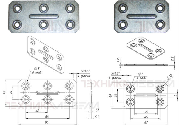 / 201 01 Пластина крепежная прямоугольная, с отверстиями Ø 5 мм A 86 B 40 s 2.2